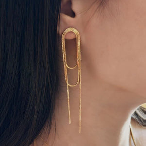 The elegant design exudes sophistication and offers a contemporary twist on the classic drop earring.