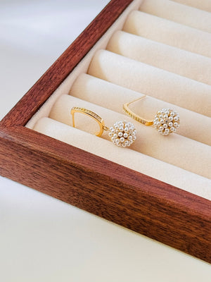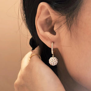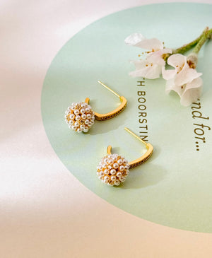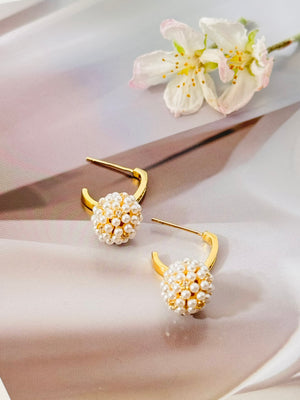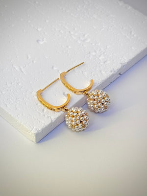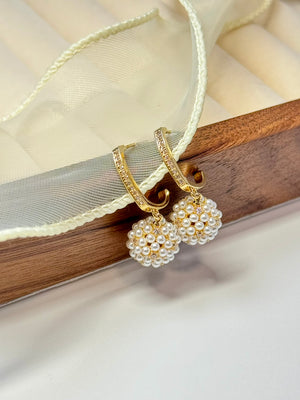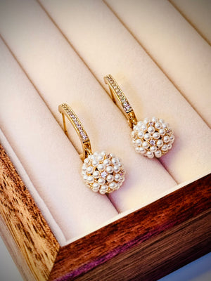 These elegant gold-tone hoop earrings feature a charming cluster of small, simulated pearls in a spherical design, accented with a touch of sparkle from pave-set crystals.