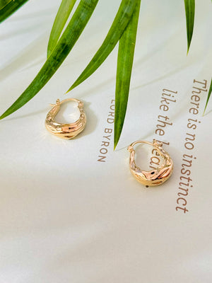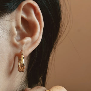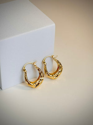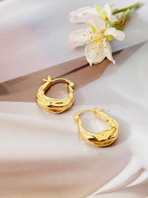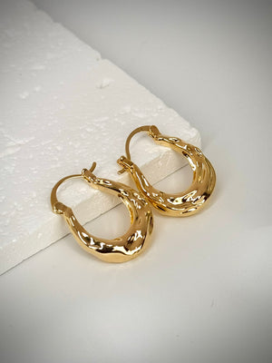 These hoops are crafted with a twist, featuring a flowing ripple pattern that adds texture and a dynamic finish to the lustrous gold.